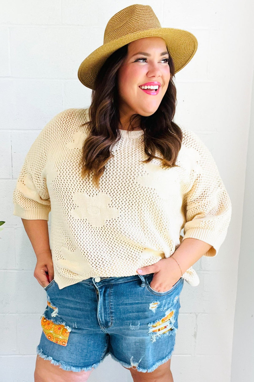 Feel Charming Oatmeal Floral Netted Crochet 3/4 Sleeve Sweater Top